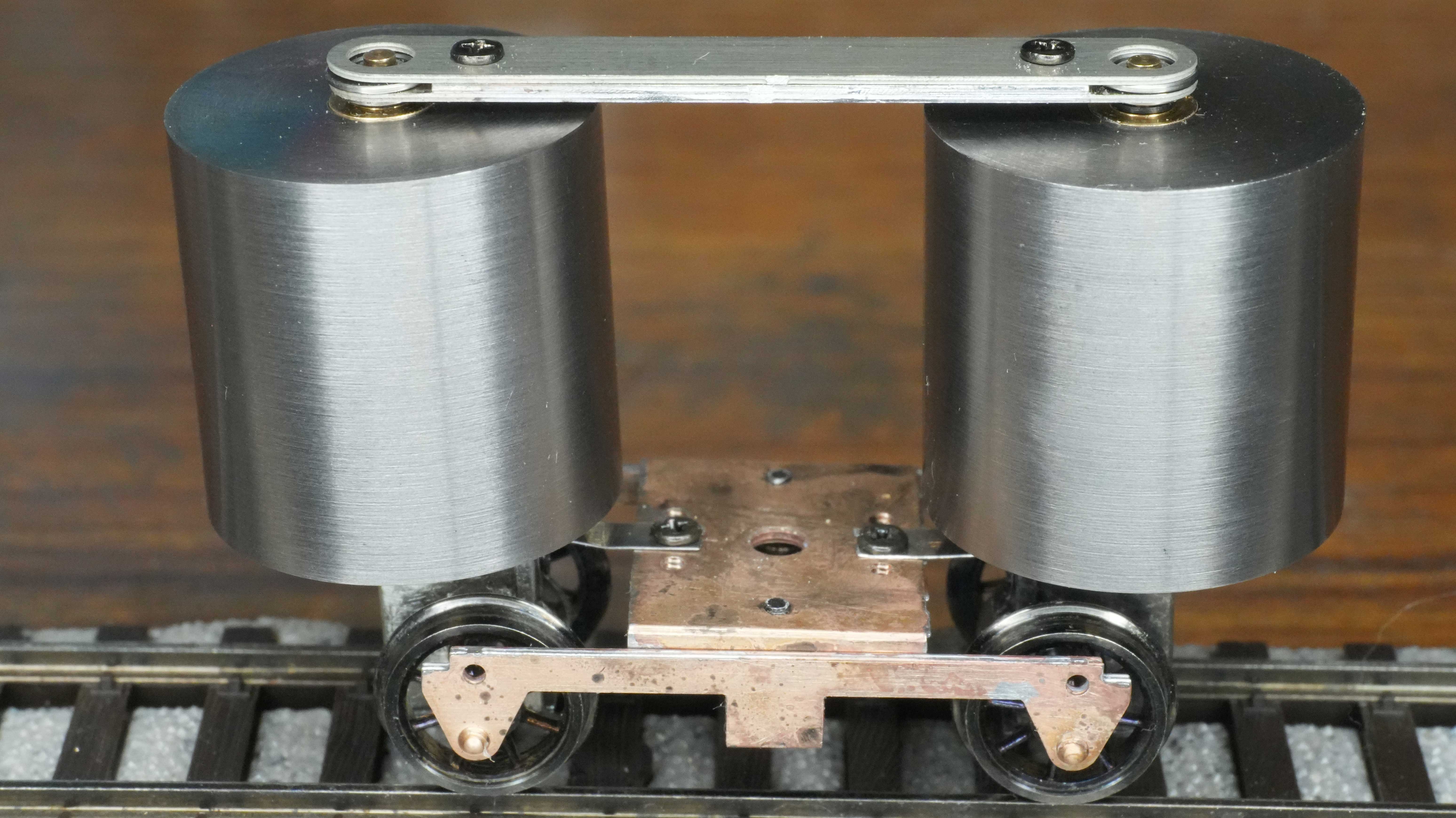 手で慣性増大装置付台車を押して動かすと機関車もそれなりに惰行するようですので、対策としては慣性増大装置付台車上の重量を増やすか、車輪とレールの摩擦係数を増やすということになります。